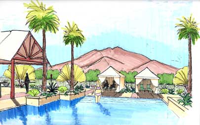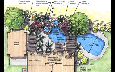 - Custom trellis, fire pit and barbeque, pool, entertainment space and water feature design
