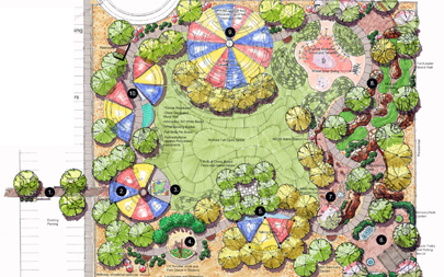 The Cleland Group design team worked closely with the staff of Opportunity Village, a non-profit organization that specializes in the training of mentally challenged adults, in the development of a multi-station fully accessible "Life Experiential Park" to augment the training of their clients in the areas of art, music, motor skills, time management, mathematics, social skills and other life experiences. The first of it's kind, the park is being developed to complement the recently completed Ralph and Betty Engelstad Campus at Opportunity Village, in Las Vegas, Nevada.