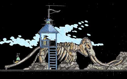 - Full size skeletal Mammoth play structure purges through a glass window into the library reading room combining learning and play based on local paleontological findings.