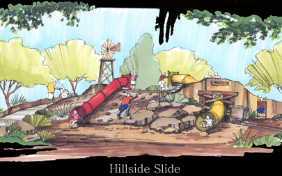 - "Mining Town" x-game play area including a zip line, tube slides through the hillside, water jet play area, and rock climbing wall